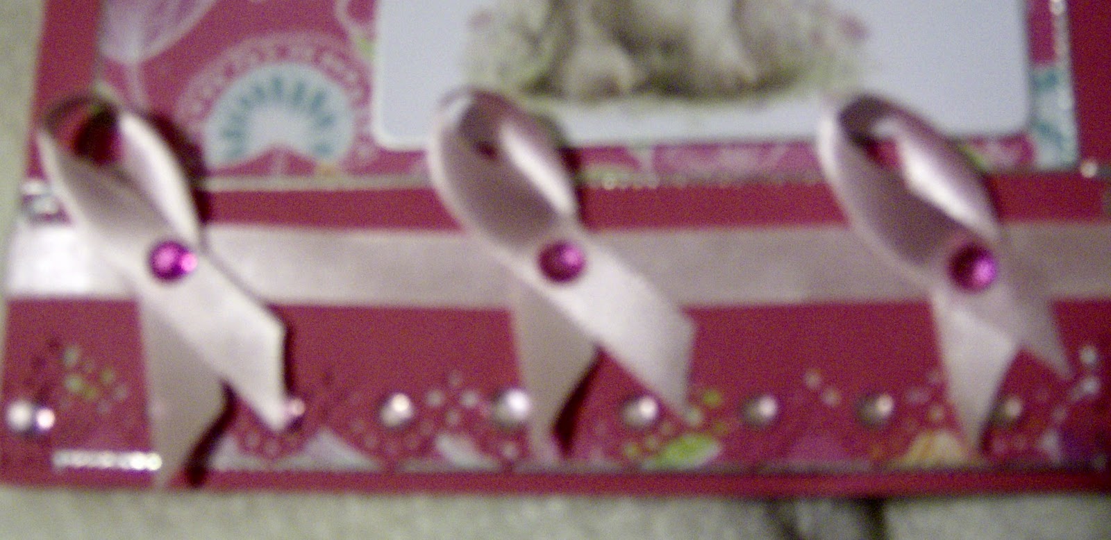 I made this card from simple pink card, pink ribbon and some pick and white flowers, gems to embellish the card. I used a Lilly of the Valley die cut image, which I thought was just the right one, as memories was my verse and who else would have the best memory.... an elephant ! and how sweet it is blowing bubbles. I used backing paper from a free paper pad in a crafting magazine and a Martha Stewart paper punch to decorate the pink card underneath the ribbon row of breast cancer awareness bows.